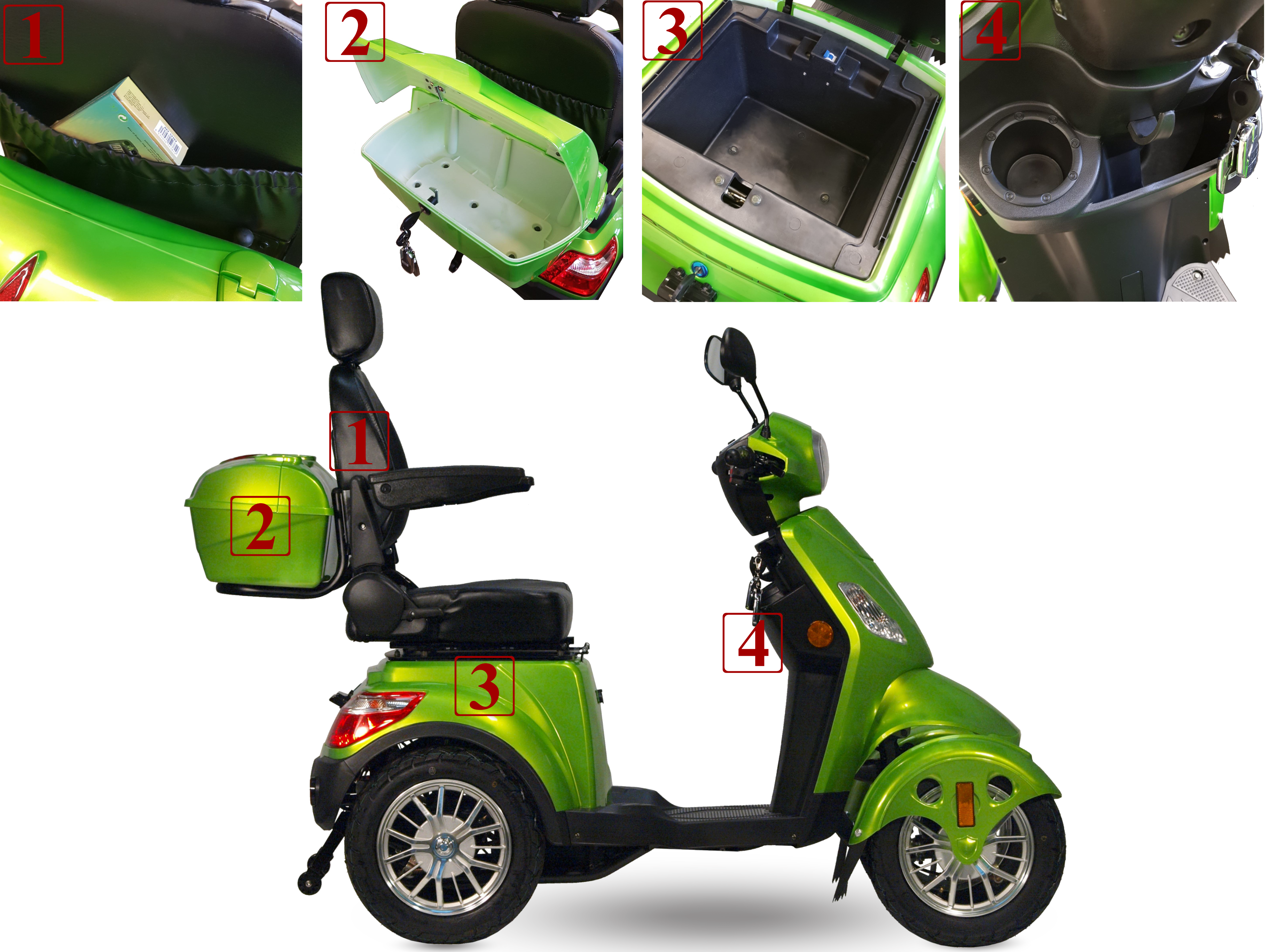 Keturratis turi dvi didesnes daiktadėžes: po sėdyne (Nr.3) ir už jos (Nr.2); dar viena daiktadėžė, kabliukas ir vieta gėrimo tarai sumontuota priekyje žemiau vairo (Nr.4). Kišenėlė už sėdynės knygai ar smulkiems daiktams (Nr.1).